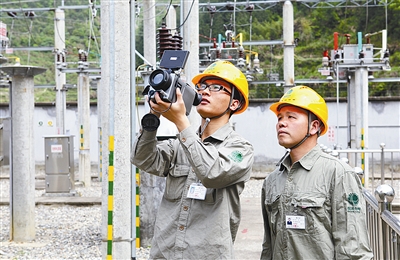 景宁供电公司运维检修部运维班职工正用红外线测温仪认真给设备测温。为扎实做好迎峰度夏和防汛工作期间的电网安全供电工作,该公司于近期对全县10座35千伏变电站设备加强了巡视。 (通讯员 陈龙伟 摄)