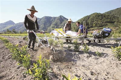 近日,鹤溪街道九重洋村里,凤艳家庭农场的茶园正使用山地轨道车运输肥料,该轨道车全长500米,投入资金20多万元,解决了以往全靠人工挑运肥料的问题。此外,该茶园管理中还使用了茶园深耕机、割草机、开沟机等。