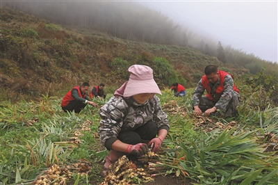近日,大地乡300余亩生姜迎来丰收,该乡志愿者们走进柳叶垟村生姜种植基地,帮助村民们一起进行采收工作。今年,大地乡首次引进新品种“云南小黄姜”,具有鲜嫩、清脆、香浓等特点,亩产预计可达4000斤。新鲜收获的生姜经过剪茎、分拣、装袋后,一部分将直接通过市场销售,另一部分则会送到药企进行深加工,以延长生姜的生产链提高附加值。