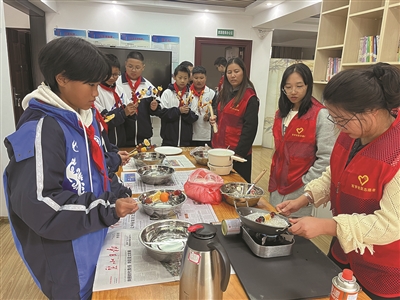 日前,鹤溪街道百岁社区在县民族中学心理室内开展“这个星期有点甜”主题关爱活动,通过制作自制冰糖葫芦,和学生们共度甜蜜的一天。图为社区工作人员指导学生制作糖衣。