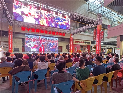 9月3日上午,在东方江泰广场党群服务公益大舞台,巨大的电子屏幕前坐着不少市民,大家神情专注,共同收看纪念中国人民抗日战争暨世界反法西斯战争胜利80周年大会直播盛况,一起重温历史记忆,见证祖国的强大。